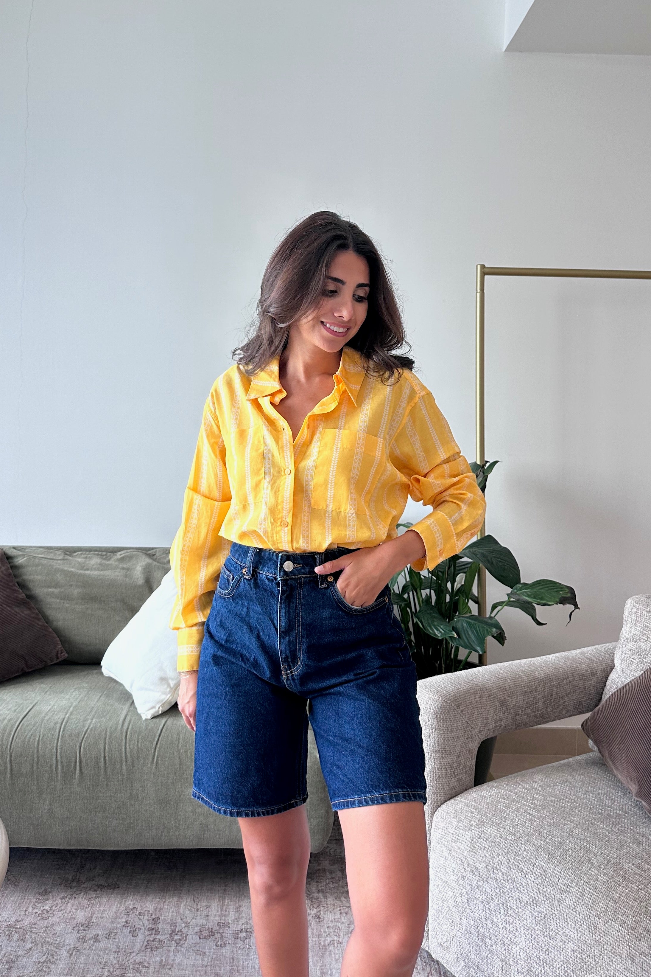 The bright yellow tone brings warmth and vibrancy, while the delicate fabric drapes beautifully.