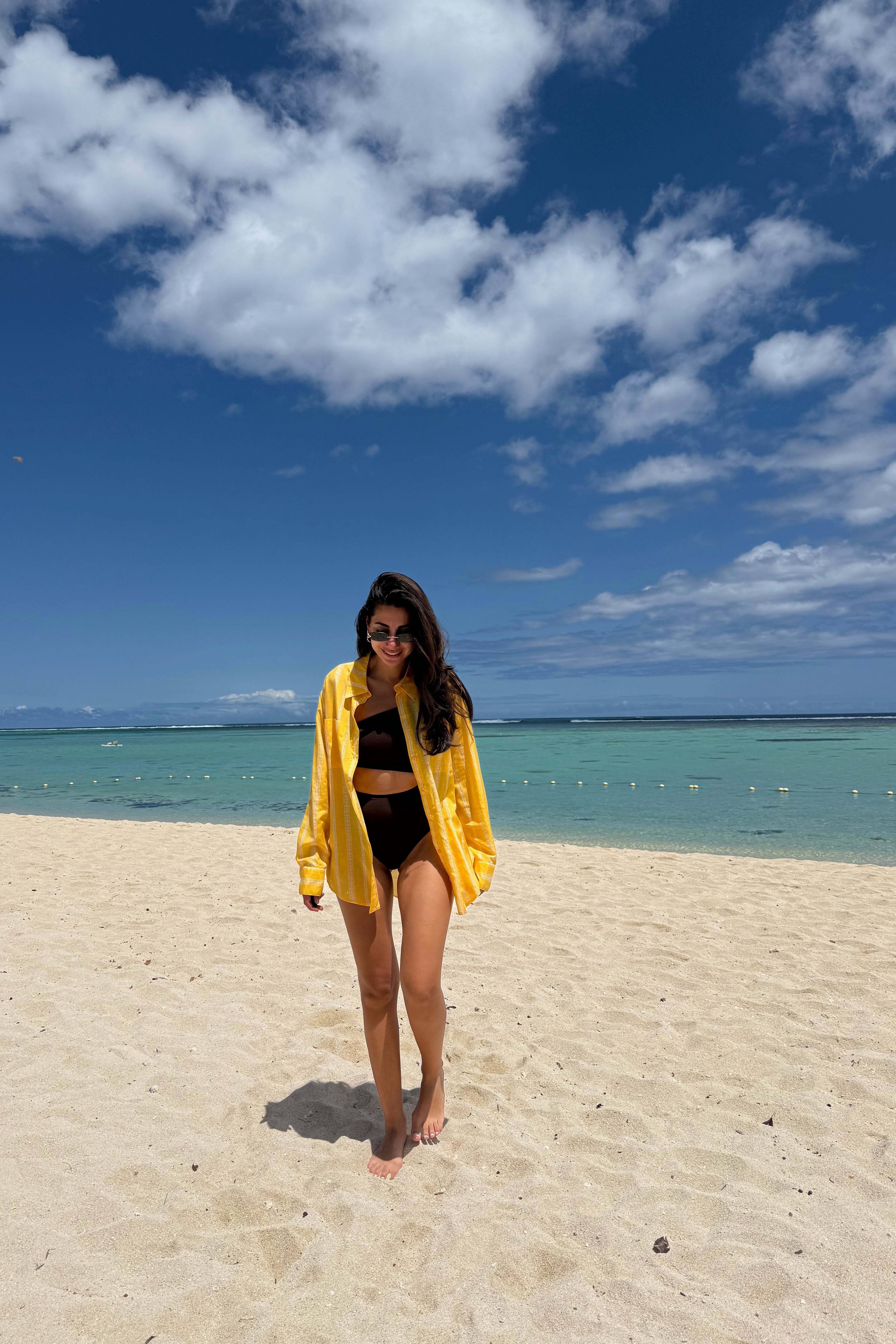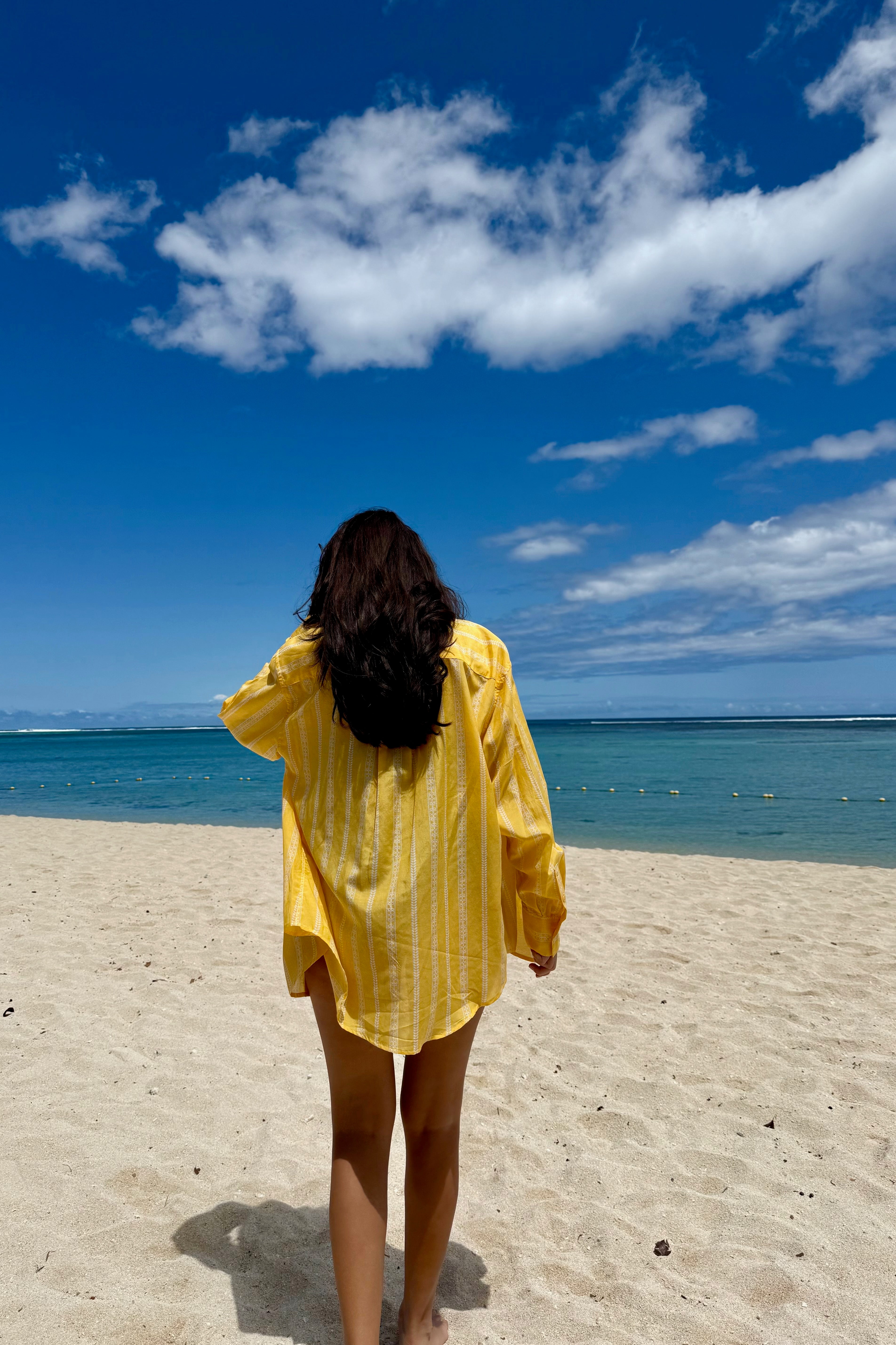 This shirt can be worn in multiple ways, open over a swimsuit for a relaxed holiday look, or tucked into jeans or linen trousers for a more polished, city-chic style.