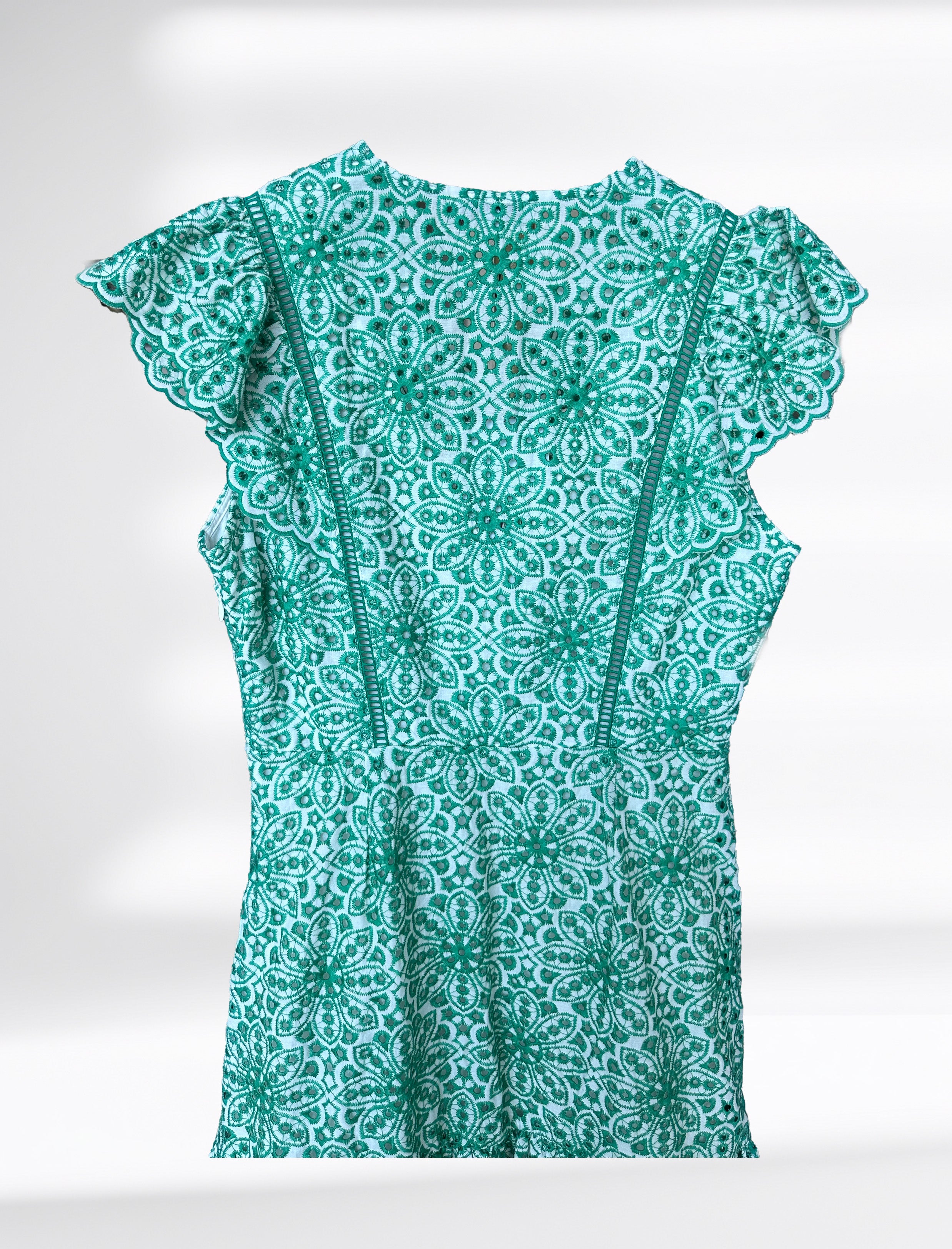 Designed with delicate embroidery, a flattering V-neckline, and ruffled shoulder details, it embodies the perfect mix of femininity and effortless elegance.