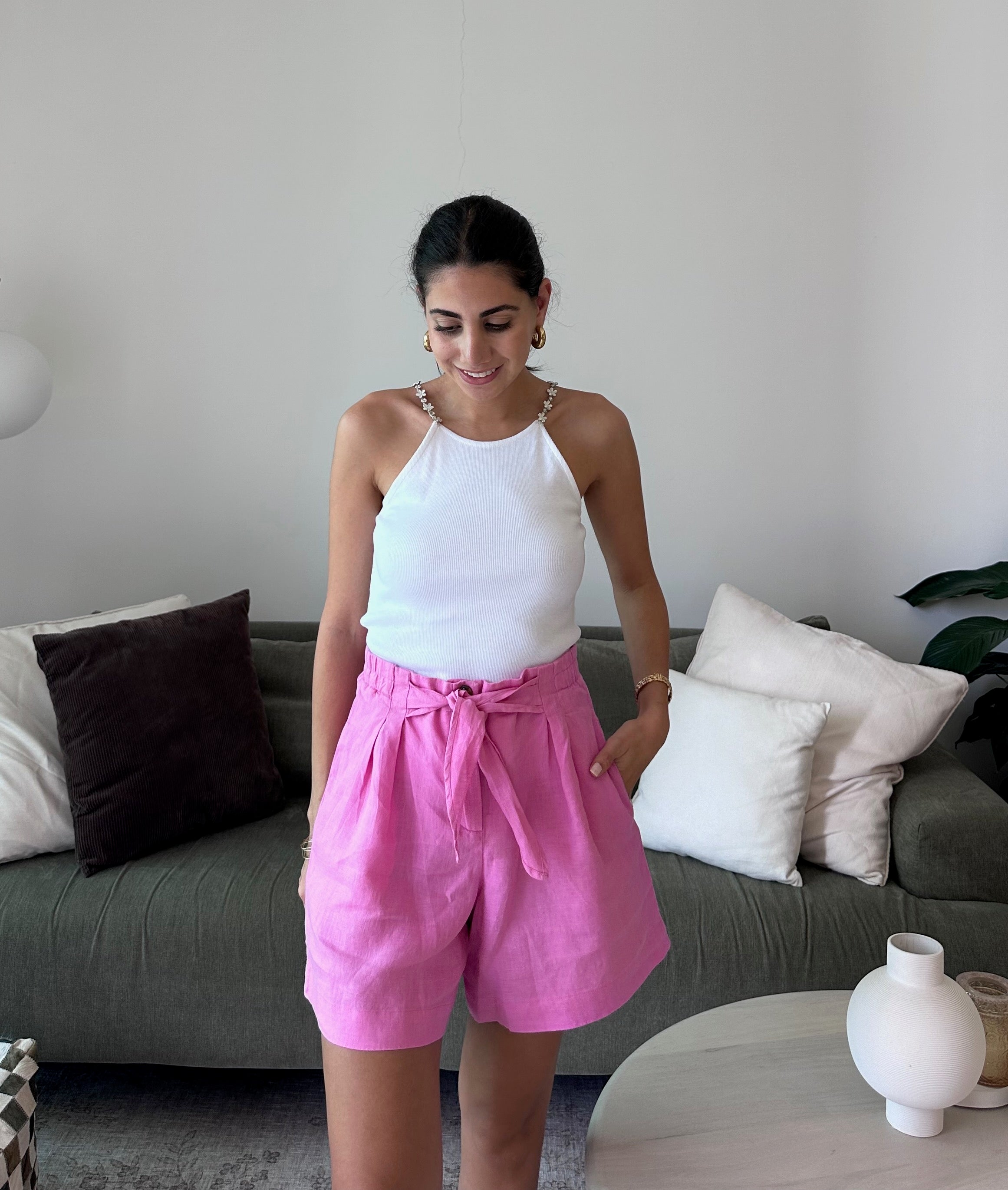 Light, feminine, and effortlessly chic, these Des Petits Hauts pink linen shorts are the ultimate Dubai essential.